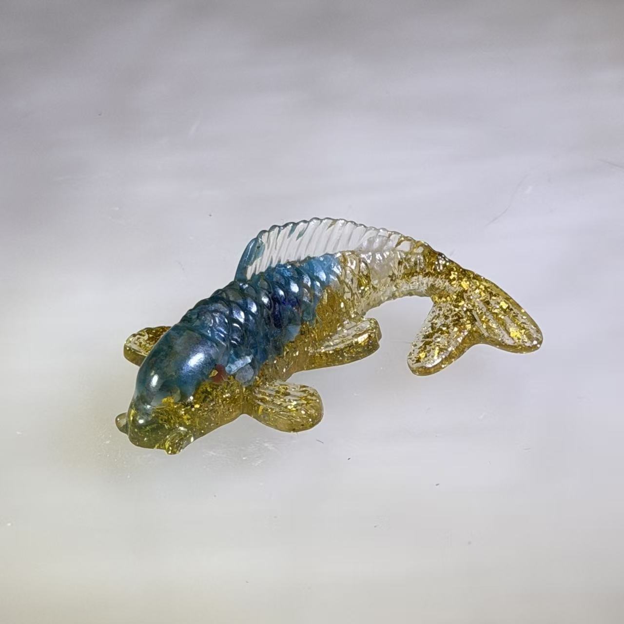 This handcrafted koi fish figurine is made using modern resin techniques, encapsulating a vibrant mix of clear, blue, and gold colors reminiscent of precious Blue Apatite minerals, along with shimmering gold flakes that catch the light beautifully. The sculpture perfectly captures the dynamic, flowing posture of a swimming carp. The transparent finish gives it a glossy, gem-like appearance, creating a striking decorative piece that adds a touch of modern artistry and dynamic energy to any space.