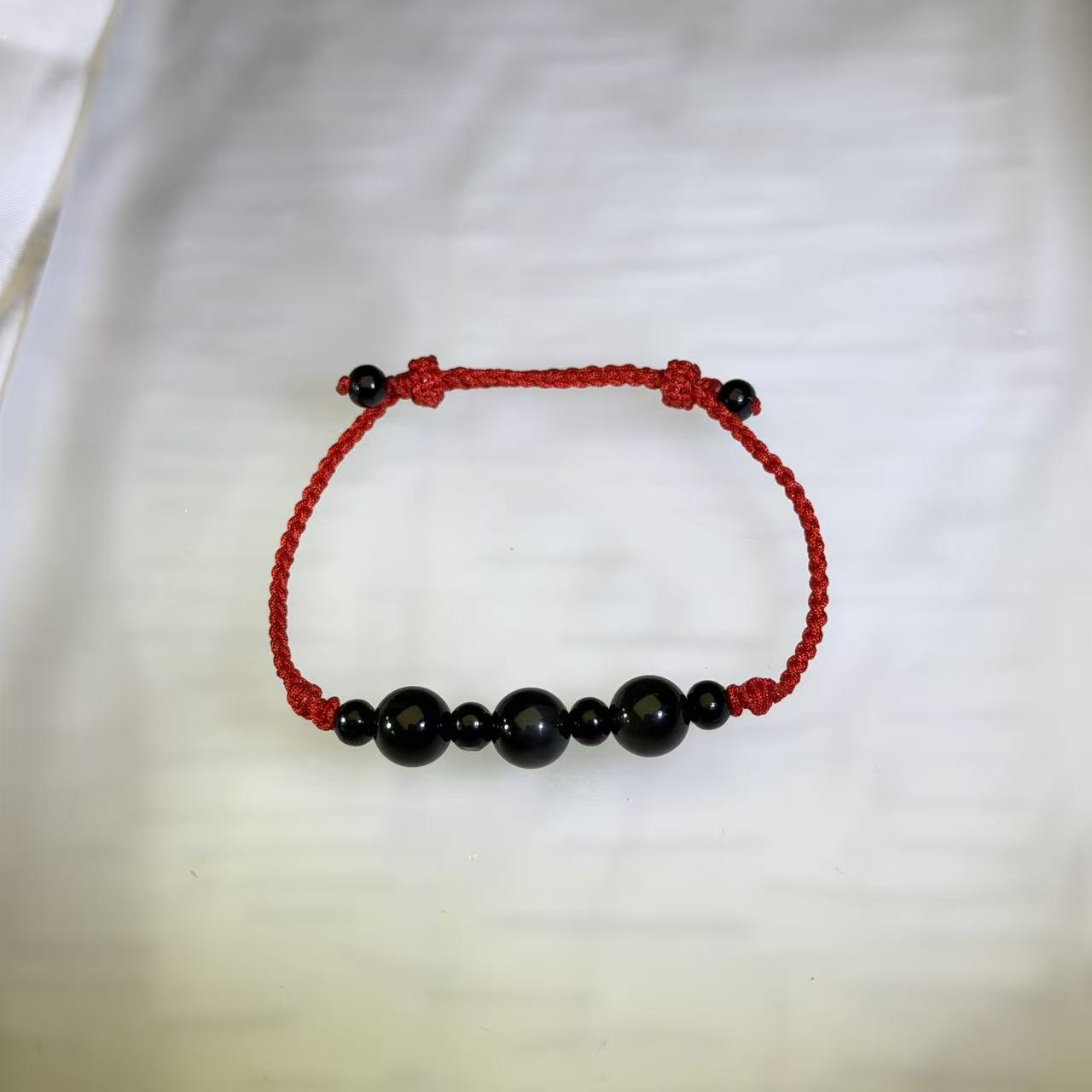 Rainbow obsidian is associated with properties of protection, grounding, and healing. It is believed to shield the wearer from negative energy, provide insight into emotional blockages, and promote spiritual growth. Ebony is traditionally valued as a powerful talisman against evil spirits and bad luck, offering strength and stability. The red string itself is a symbol of luck, protection, and destiny. This comprehensive blend makes the bracelet ideal for daily wear to carry protective and lucky energy close to the body, or as a thoughtful gift for loved ones during birthdays or special occasions, symbolizing strength, protection, and good fortune.