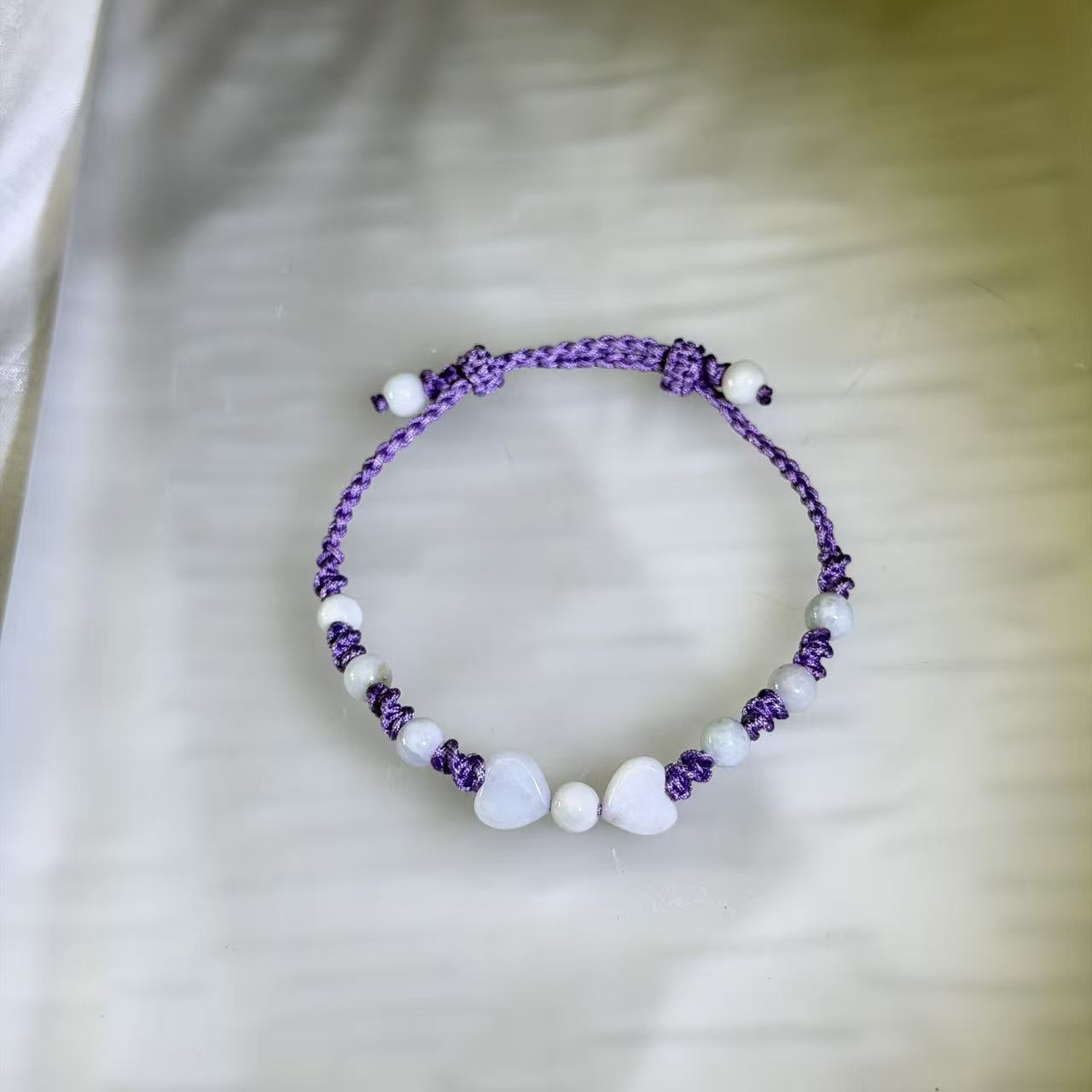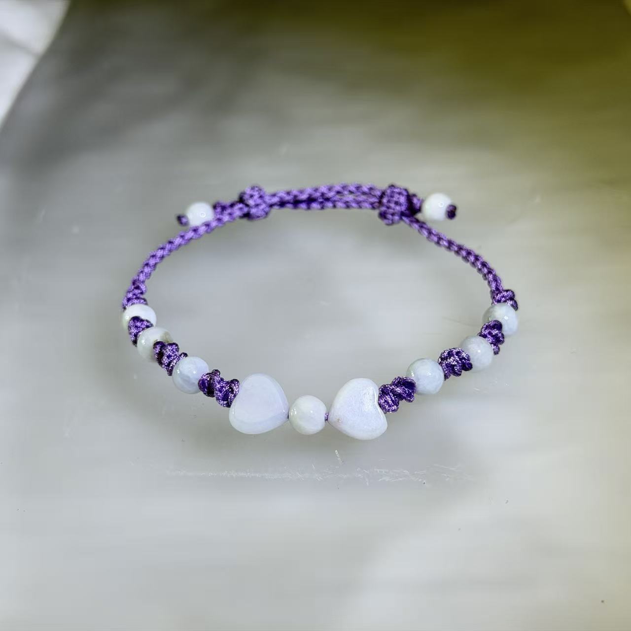 This adjustable handwoven bracelet features two white jade heart beads arranged into a bow-shaped design, complemented by smooth white jade round beads. Crafted with a lavender-toned nylon cord, the design balances softness and structure, creating a delicate yet charming aesthetic. The adjustable construction ensures comfortable wear, making it suitable for daily styling or as a thoughtful gift.