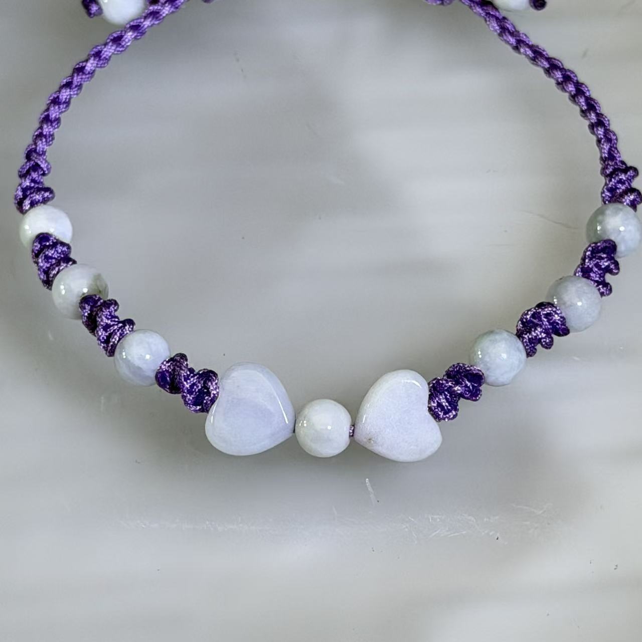 这款可调节手编手链以两颗白色翡翠爱心拼接成蝴蝶结造型,并搭配白色翡翠圆珠,整体设计温润柔和。薰衣草紫色尼龙手编绳为造型增添一抹柔美气息,既甜美又不失清新感,适合日常佩戴,也是一件富有心意的赠礼之选。