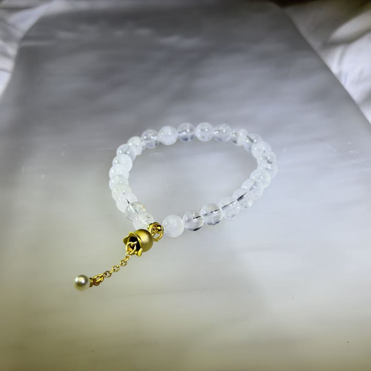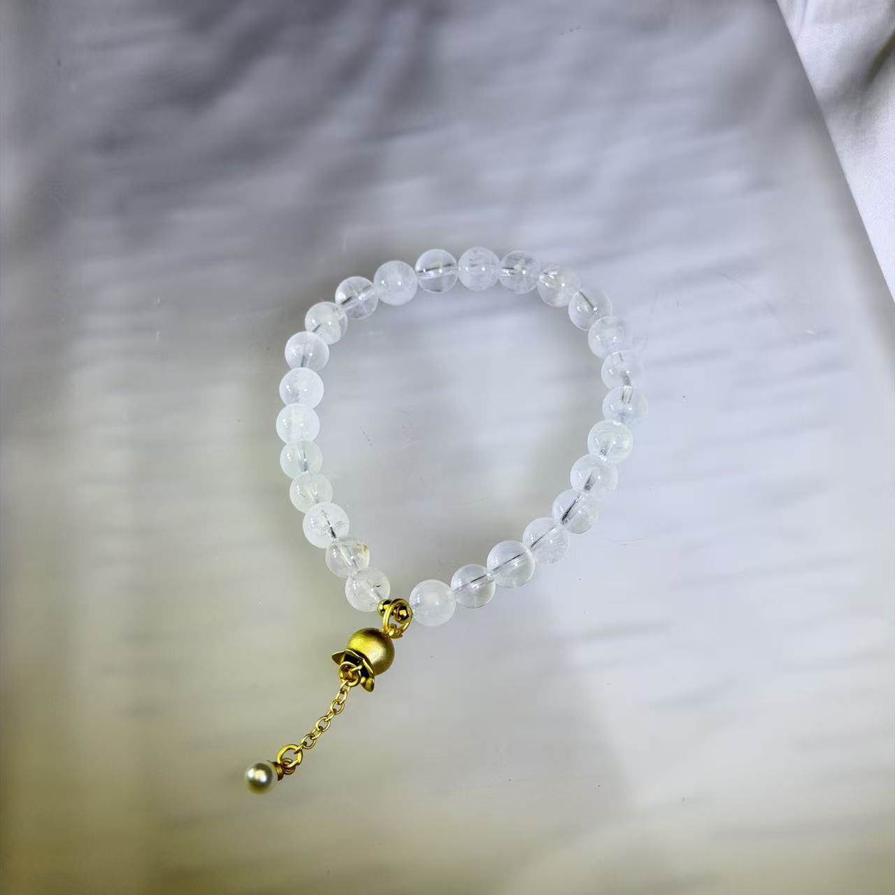 白幽灵水晶手串以白幽灵水晶圆珠为主体,搭配金色铃兰花小挂饰作为点缀。白幽灵水晶内部可见若隐若现的幽灵层理结构,通透之中富有层次感,呈现出柔和而清雅的视觉效果。铃兰花造型精致细腻,为整体增添一丝优雅与温柔气息,使手串在简约中不失装饰美感。