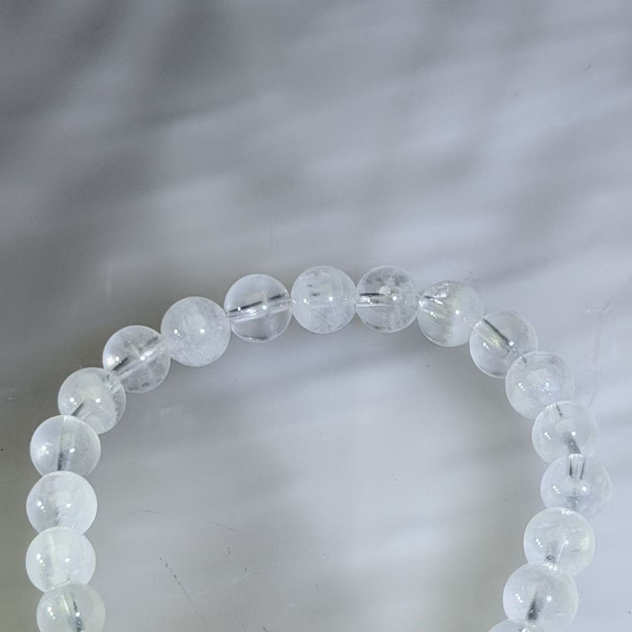 White Phantom Quartz is believed to symbolise clarity, purification, and personal growth. It is often associated with clearing negative energy, enhancing focus, and supporting inner reflection and self-awareness. The phantom inclusions are thought to represent layers of experience and growth, encouraging patience, resilience, and steady progress. White Phantom Quartz is also believed to amplify intentions and promote emotional balance and calmness. Lily-of-the-valley symbolises purity, renewal, happiness, and gentle blessings, often associated with positive beginnings and heartfelt wishes. Together, White Phantom Quartz and the lily-of-the-valley motif are believed to support emotional clarity, inner peace, and graceful personal growth. This bracelet is suitable for daily wear, meditation, and social occasions, and also makes a meaningful and elegant gift conveying purity, hope, and gentle blessings.
