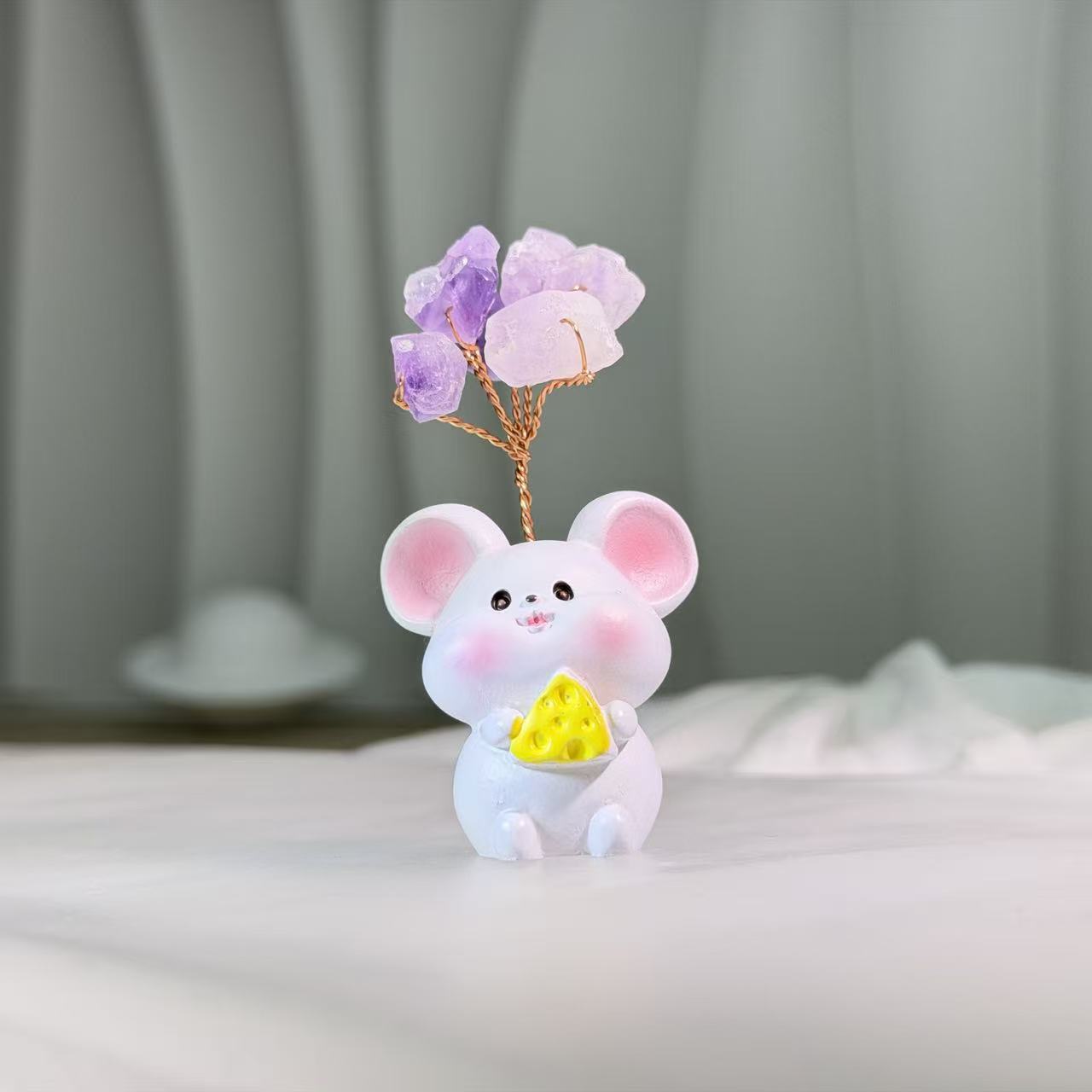 这款高品质的紫水晶树小老鼠摆件将大自然的原始美感与灵动趣味完美结合。它采用了数颗紫水晶,展现出从深邃紫色到淡雅丁香色的迷人色调。这些宝石通过手工红铜线缠绕,形成一棵精致的树,从一只怀抱奶酪的可爱树脂小老鼠身后生机勃勃地探出。这款比例精巧的作品堪称空间中的萌系焦点,能瞬间为办公桌或个人空间注入温暖与奇幻的色彩。其充满童趣的设计营造出一种喜悦与充满想象力的氛围。无论是作为悦己的艺术收藏,还是作为一份传递快乐与灵性成长祝福的走心礼物,它都能彰显出非凡的治愈格调。