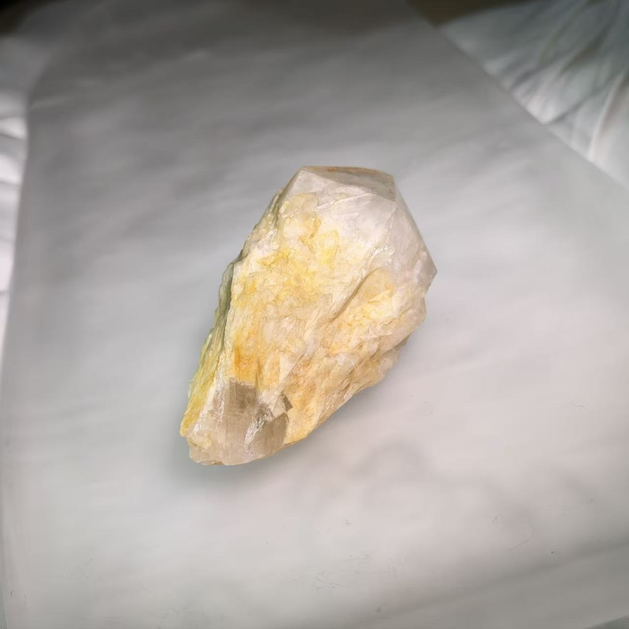 这款迷人的标本散发出深邃的能量。它采用白水晶制成,带有影响其透明度和光泽的天然金黄色褐铁矿包裹体。其原始、未经抛光的形态基部展现出复杂的骸骨生长习性,提供了强大、富有洞察力的美感,适合家居装饰或个人展示,有望增添独特的个人风格魅力,也非常适合作为赠送亲友的一份贴心礼物。