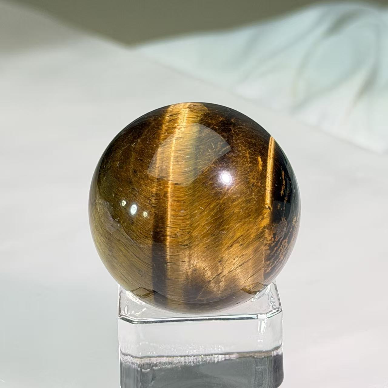 Yellow tiger's eye is a powerful stone of protection, grounding, and good fortune, often worn as an amulet against curses or ill wishes. It is deeply associated with the sun and earth energies, bringing immense courage, confidence, and focus. It is believed to help the wearer to release fear and anxiety, fostering emotional stability and practical thinking. Tiger's eye enhances objectivity and perception, encouraging one to tackle challenges with unwavering resolve. Its stimulating energy invites continuous luck, prosperity, and career success. The sphere shape symbolizes wholeness, attracting peaceful energy and good fortune to any space. This unique piece embodies protection, abundance, and confidence.