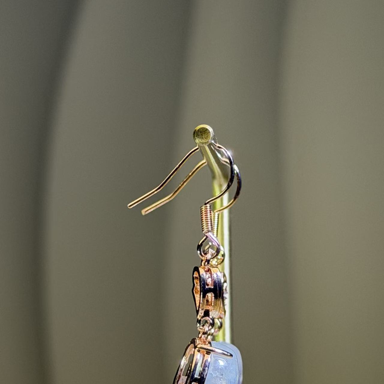 These drop earrings feature a light blue aquamarine cabochon as the centerpiece, suspended from a rose-golden hook, accented with small CZ details. The transparent, pale blue hue of the aquamarine highlights the stone’s delicate clarity and serene beauty, creating a fresh, romantic, and graceful look.