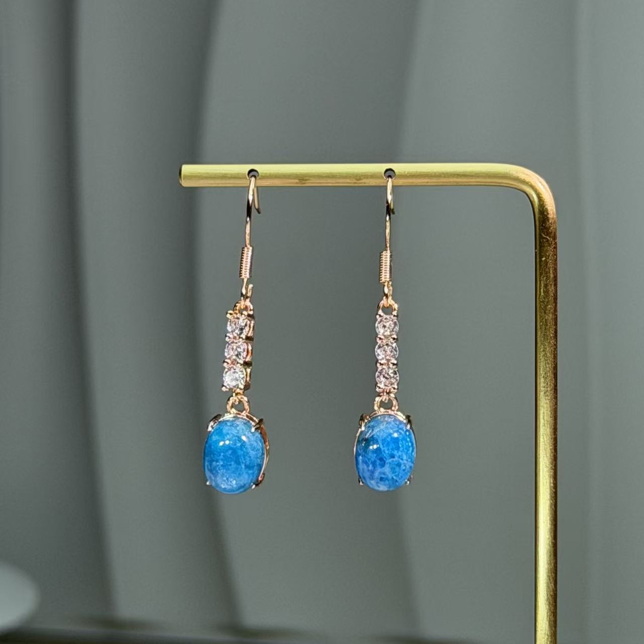 This striking pair of blue apatite drop earrings features vibrant oval stones and sparkling accents, designed to catch the light and showcase the gemstone's natural allure. The earrings are made from lustrous rose gold-toned alloy, featuring a series of sparkling clear CZ stones above a beautiful cabochon apatite stone set in a simple frame. The combination of the vivid blue hues and the brilliant sparkle creates a captivating aesthetic that is both modern and elegant. This eye-catching accessory is highly versatile, effortlessly transitioning from professional office wear and sophisticated evening events to weekend casual ensembles, and also serves as a perfect thoughtful gift.