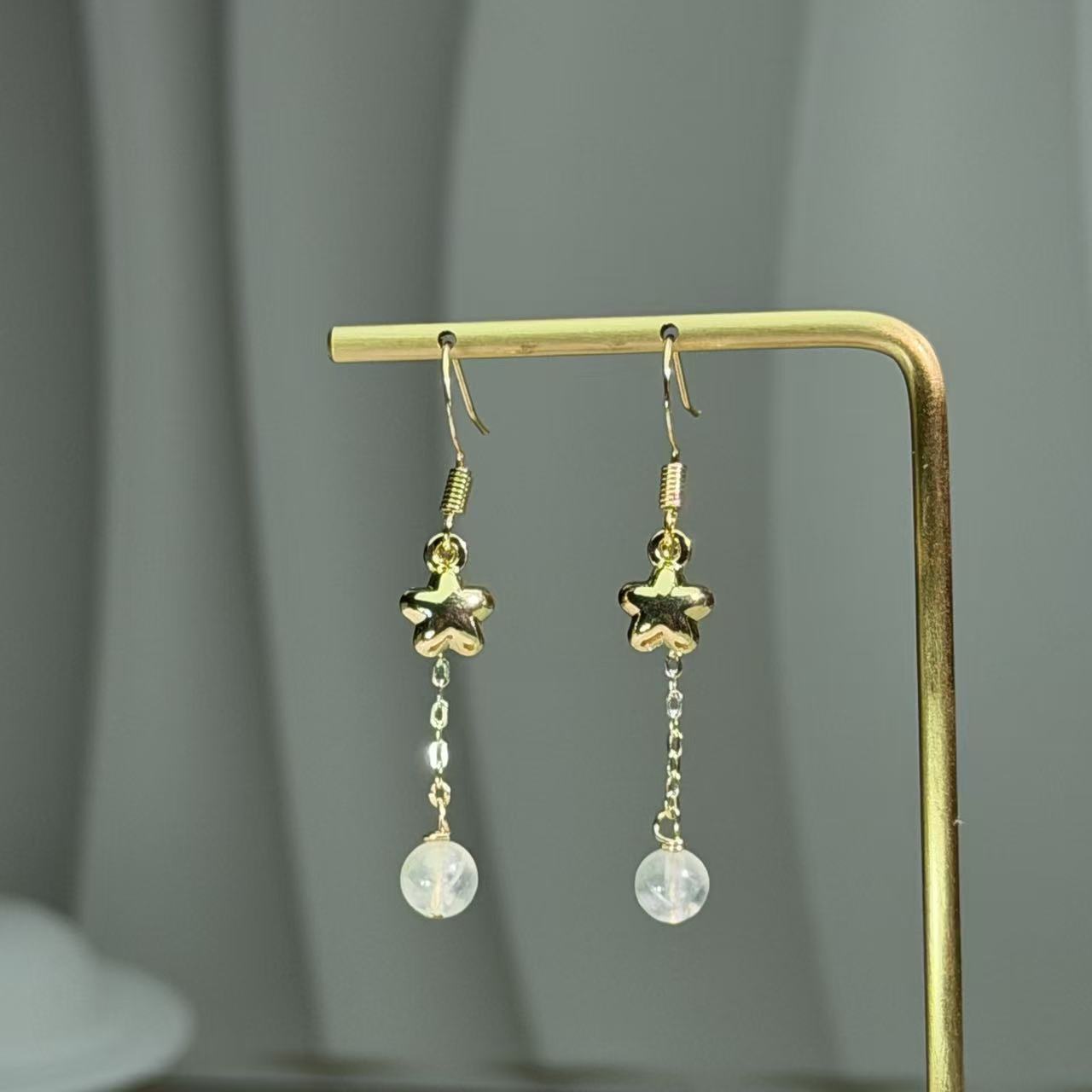This striking pair of drop earrings features a delicate gold-toned star motif crafted from lustrous 14K gold filled metal. Suspended below the star is a natural green prehnite round bead, held in a simple setting that enhances its crisp, translucent green allure, reminiscent of fresh green grapes. The combination of the vibrant green, the brilliant gold-tone, and the charming design creates a captivating aesthetic that is both modern and elegant. This eye-catching accessory is highly versatile, effortlessly transitioning from professional office wear and sophisticated evening events to weekend casual ensembles, and also serves as a perfect thoughtful gift.