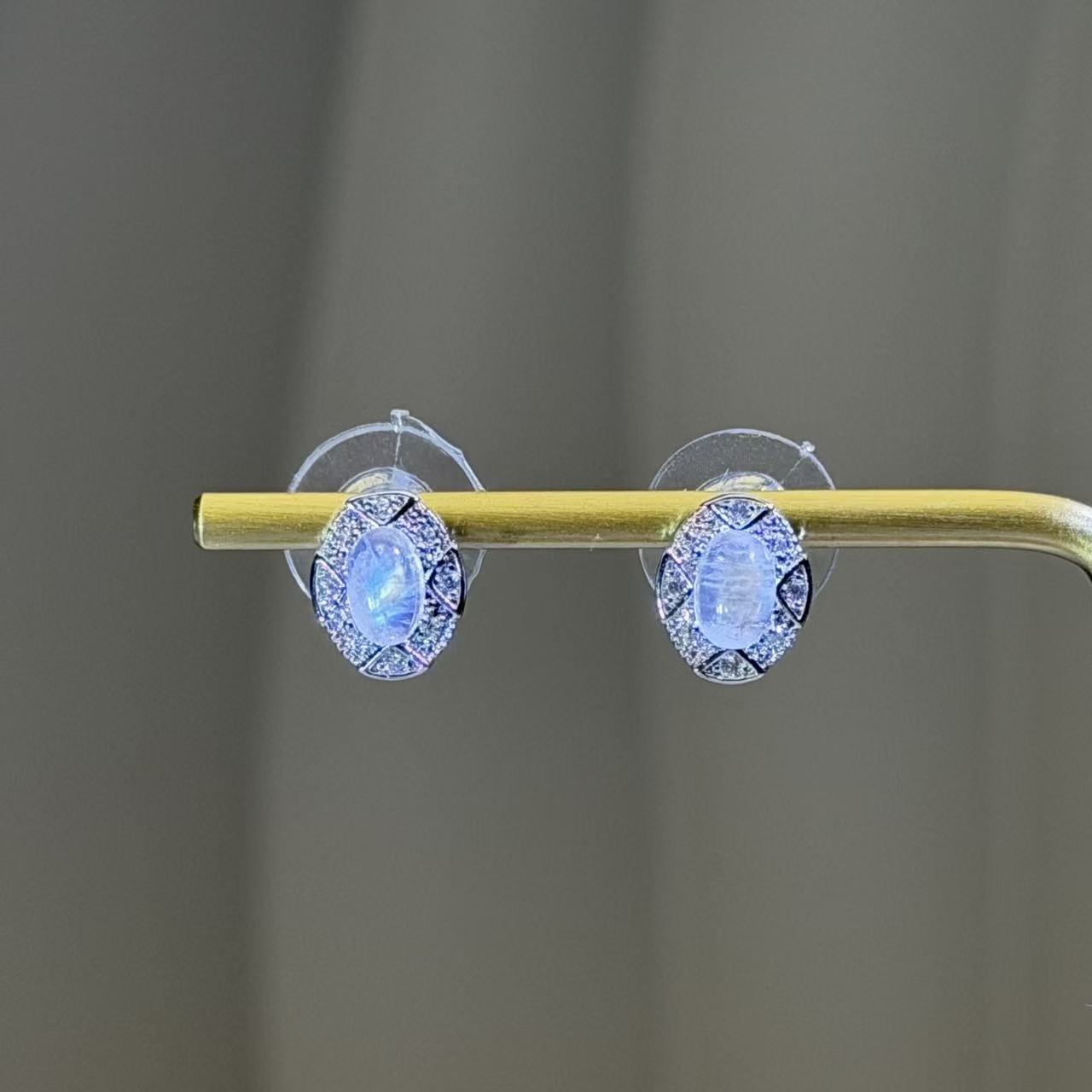这款银耳钉以月光石蛋面为主石,周围点缀精致锆石,整体呈现出柔和而明亮的光感。月光石展现出明显的强蓝光效果,光带流畅自然,晶体通透度良好,使耳钉在不同光线下都显得灵动而富有层次。锆石的点缀起到恰到好处的衬托作用,让主石更加突出,整体风格温柔优雅,耐看且具有女性气质。