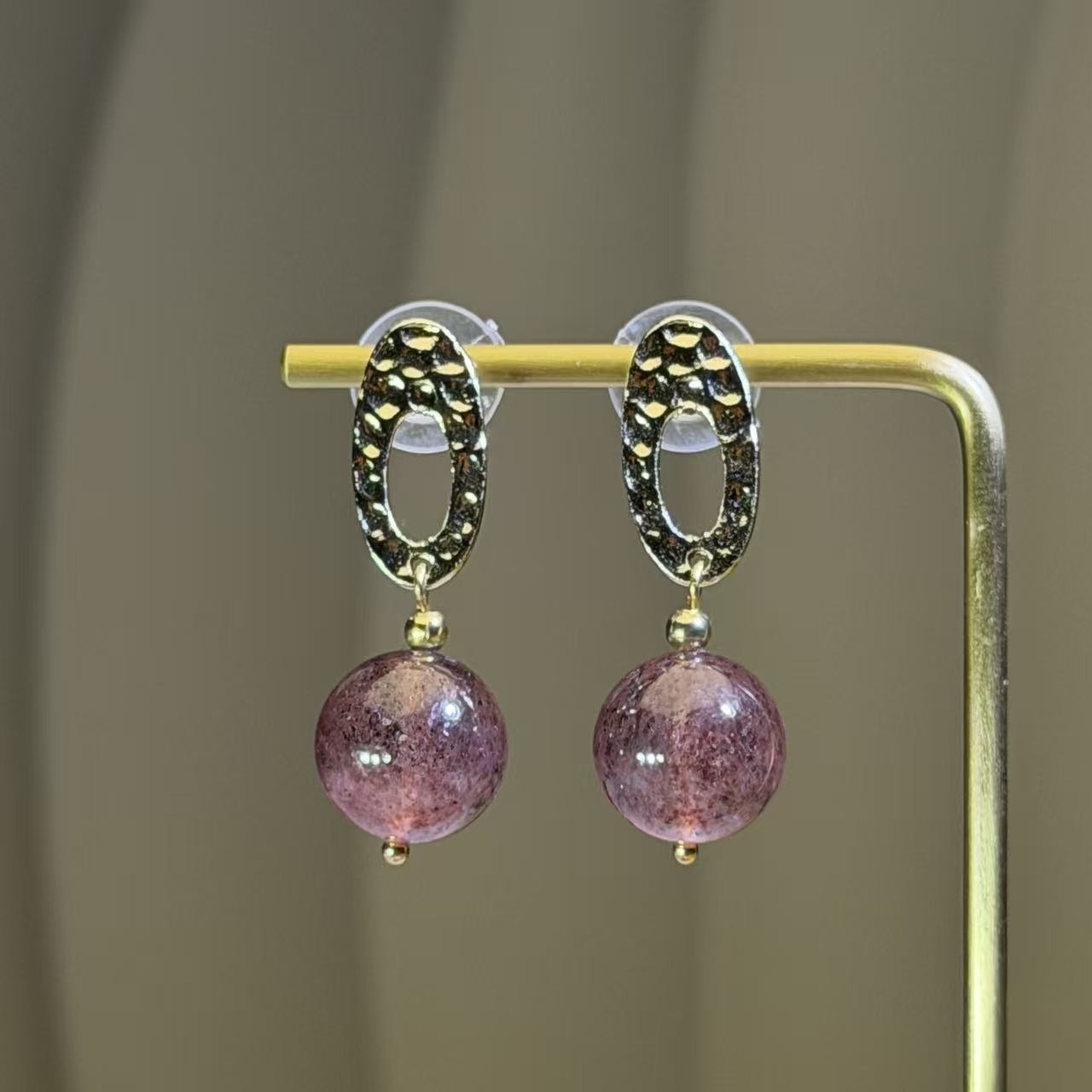 此款耳坠以浓郁红色草莓晶圆珠为视觉主体,挂于金色锤纹设计的耳针上,凸显草莓晶通透红色光泽与活力感,为佩戴者增添亮眼与自信的气质。