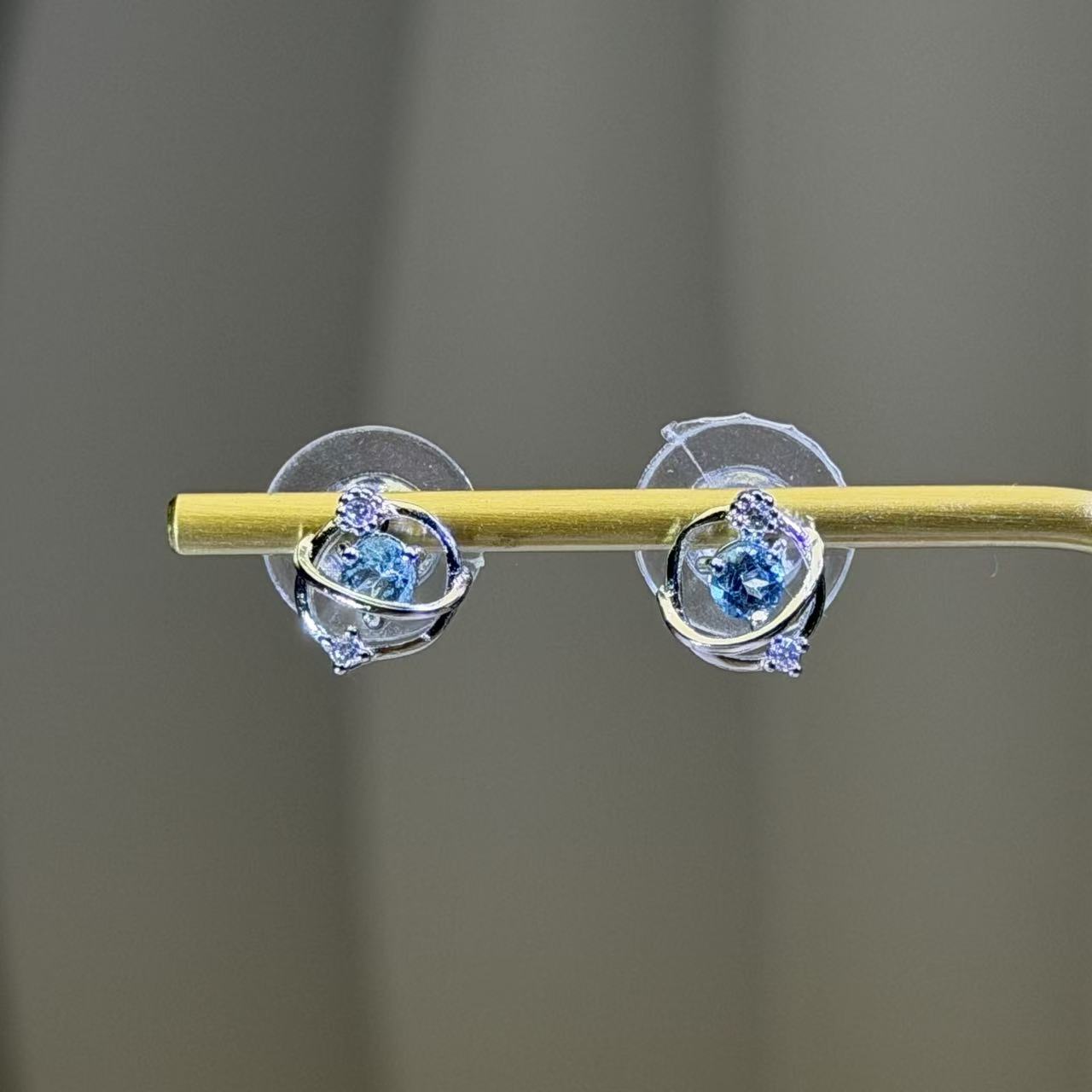 瑞士蓝托帕石镶嵌星球银耳钉