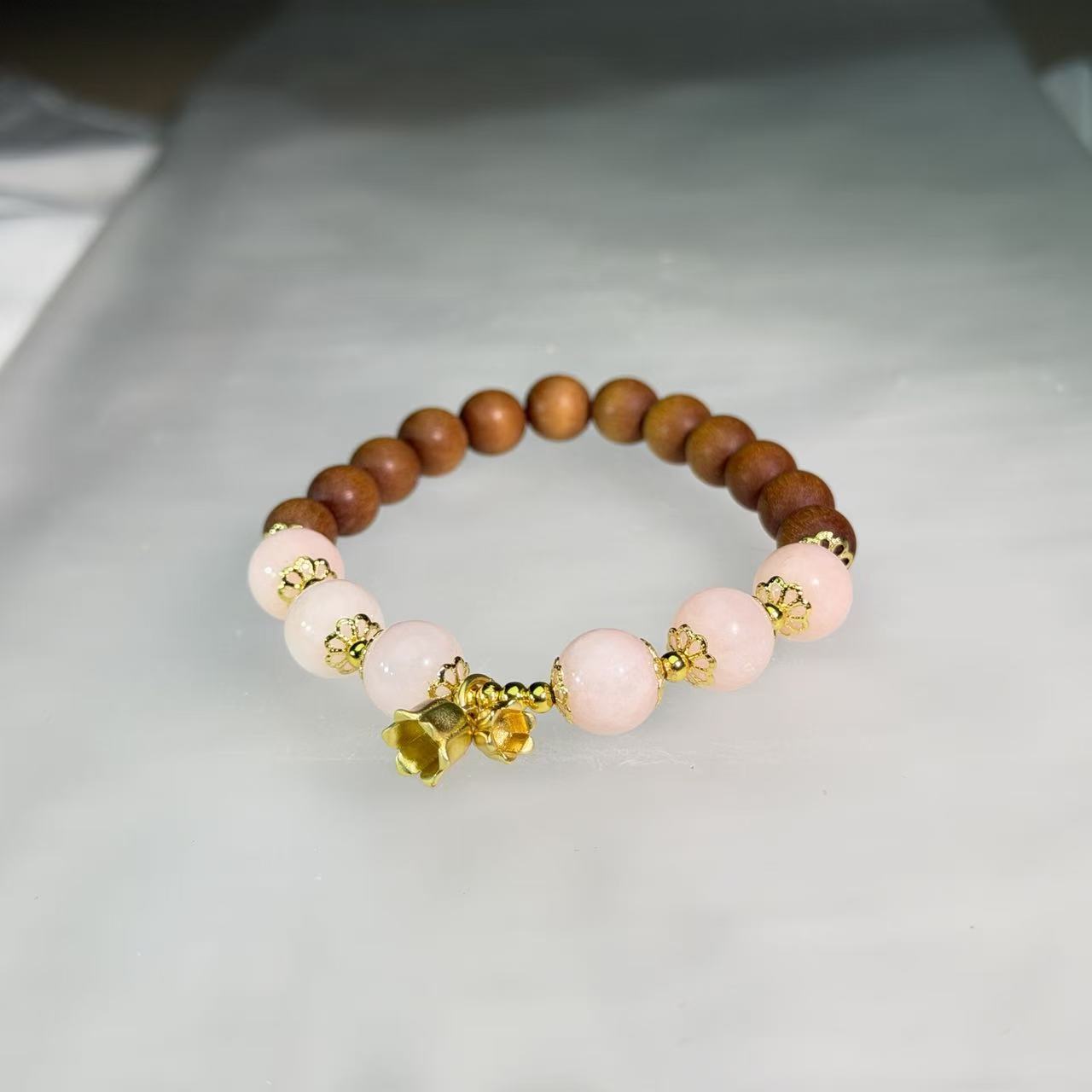 Embrace gentle, nurturing energy with this captivating beaded bracelet. It features the soft pink hues of morganite beads, perfectly complemented by fragrant sandalwood spheres and glistening 14K gold filled accents. This piece offers a warm, confident aesthetic that is lightweight and comfortable for everyday wear. This versatile accessory is suitable for professional environments, elegant evening wear, and sophisticated daily ensembles, promising to add a unique touch of personal style, and also serves as a perfect thoughtful gift.