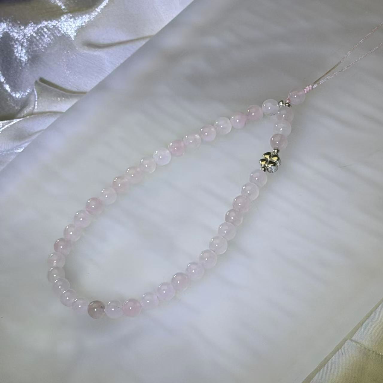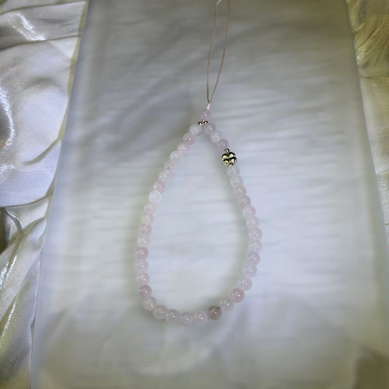 This charming and romantic loop charm features a harmonious strand of polished rose quartz round beads. The design showcases a delicate, translucent pale pink palette with a smooth, waxy luster that captures and reflects light with a gentle, comforting glow. The loop is secured by a practical white woven cord and a petite silver-toned alloy spacer bead shaped like a blooming flower, creating a sophisticated yet lighthearted silhouette that balances modern grace with a touch of feminine charm. Its versatile and durable design allows it to be easily attached to your phone, bag, or keys, serving as a serene accessory for daily use. Beyond personal style, its tranquil colors and the peaceful presence of the stones make it an exceptionally thoughtful and heartfelt gift for someone special.