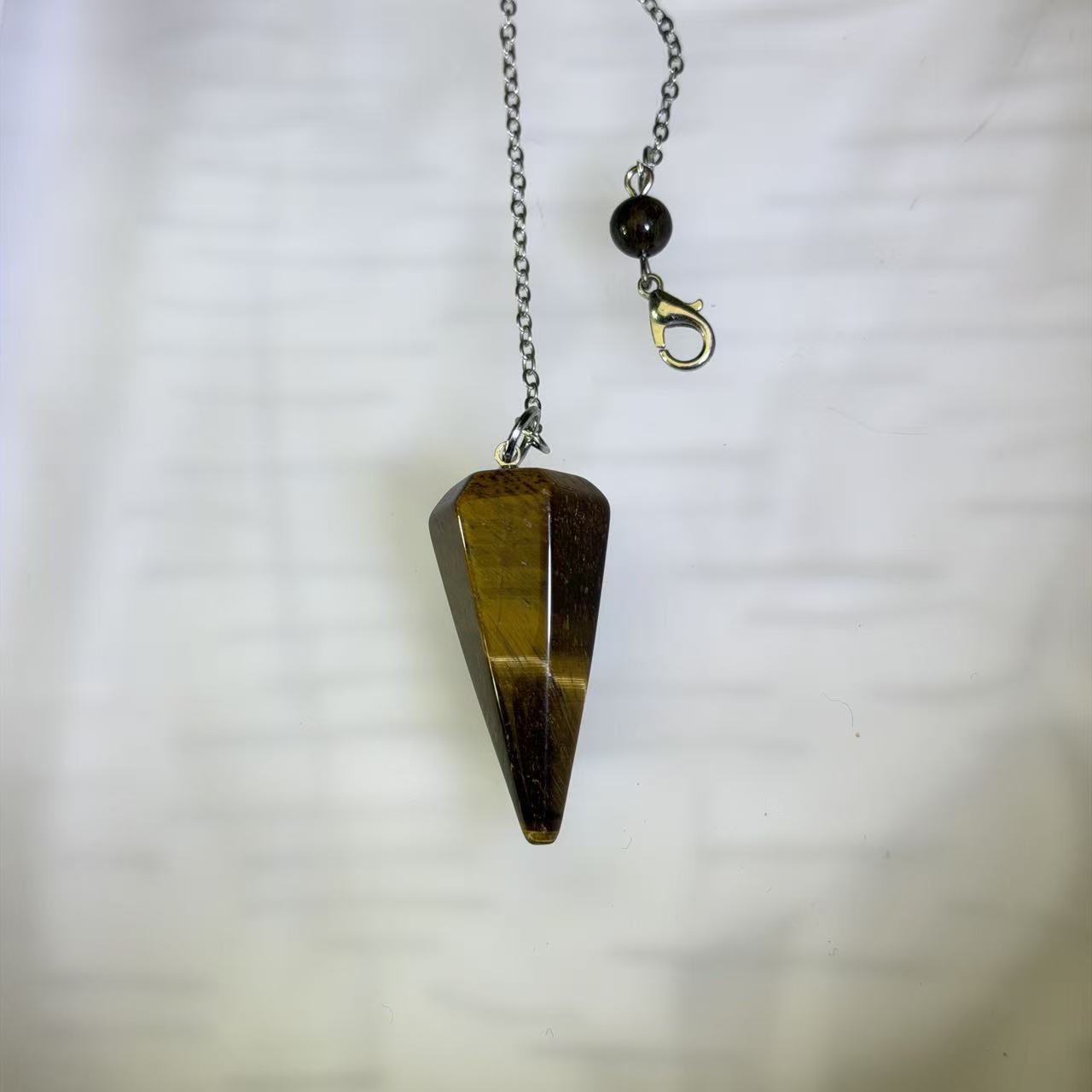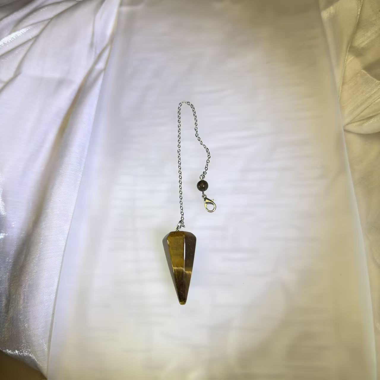 This charm features a yellow Tiger Eye hexagonal pendulum as the centerpiece, highlighting its polished surfaces, distinctive chatoyant bands, and golden sheen. While designed as a pendulum for energy work or divination, it can also be carried as a stylish charm, adding a natural, dynamic accent to daily life.