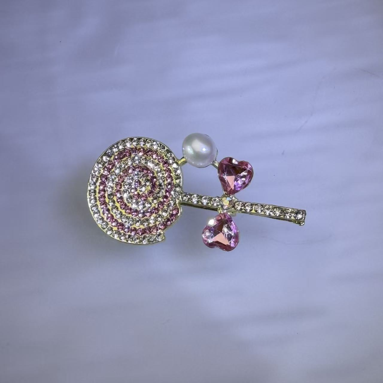 This playful brooch features a sparkling lollipop design adorned with shimmering CZ stones and accented by a luminous white freshwater pearl. The soft pink-and-white color palette and intricate detailing create a whimsical, eye-catching accessory that adds fun and charm to any outfit. Its cheerful design and radiant highlights make it perfect for bringing a touch of joy and personality to everyday wear or making a statement on special occasions.