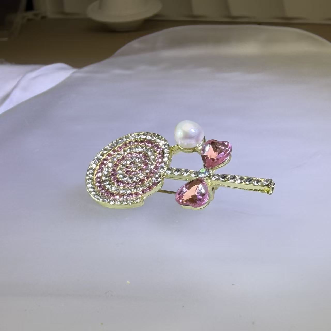 这款胸针以满锆石镶嵌的棒棒糖为设计主题,并辅以光泽柔美的白色淡水珍珠,珍珠散发温润光泽,增添精致感。粉白配色与细腻设计营造俏皮、趣味十足的视觉效果,佩戴它可为日常造型增添活力与亮点,也可在特殊场合成为吸睛配饰,展现个性与魅力。