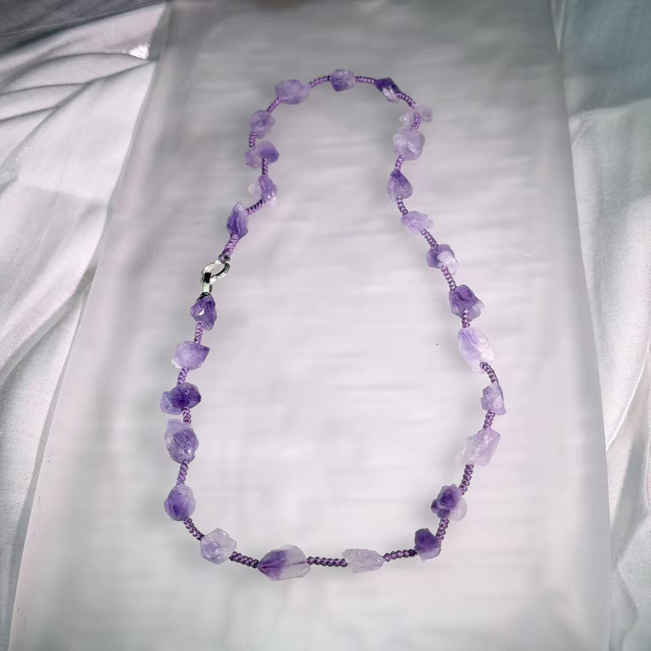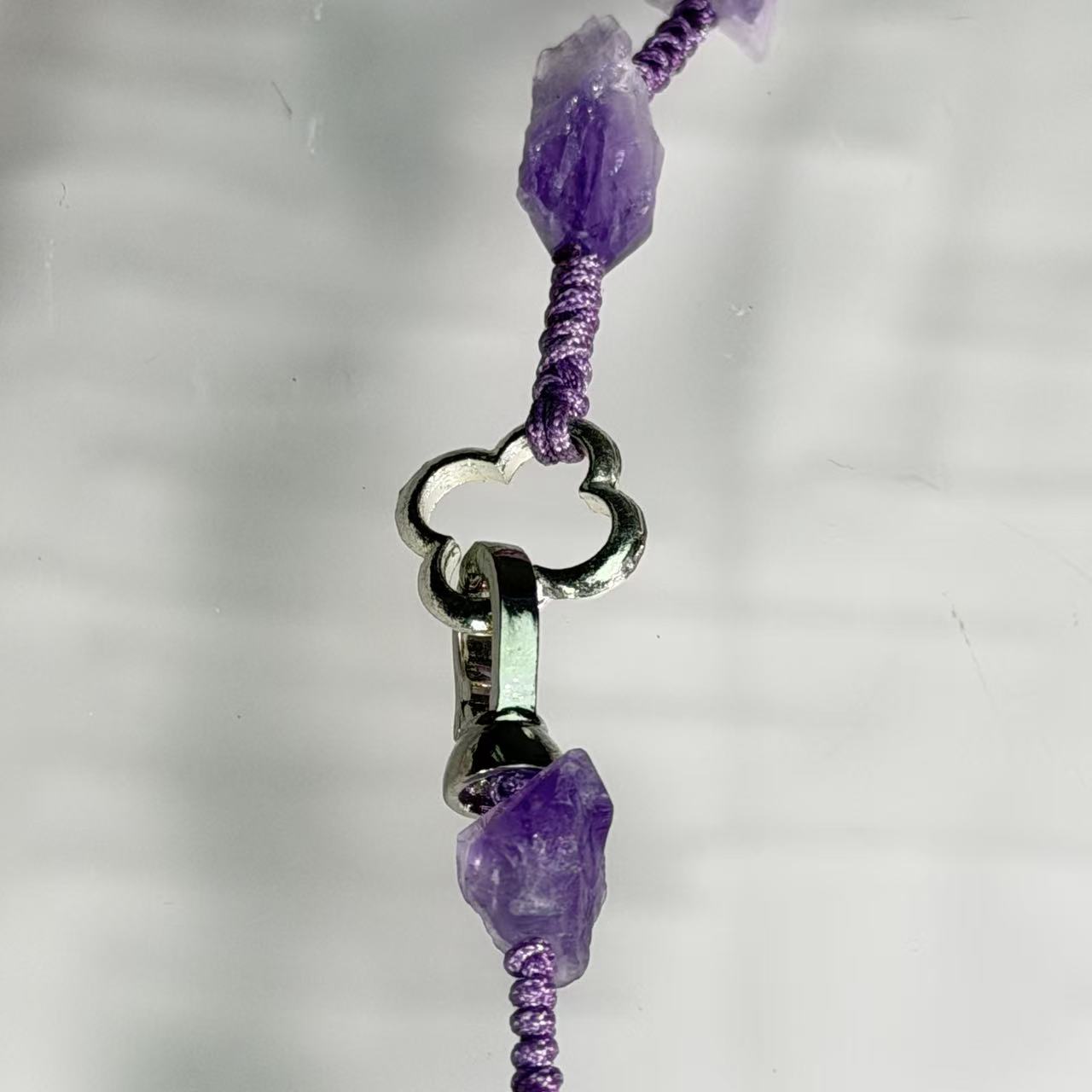 This unique adjustable necklace is meticulously hand-woven using durable purple nylon cord and features a striking assortment of natural amethyst raw nugget beads with a four-leaf clover accent. The raw, organic shapes of the amethyst, in their rich purple tones, create a captivating, high-quality, and authentic aesthetic. The necklace can be clasped anywhere along the cord for a perfect, adjustable fit. This stunning piece offers an elegant appeal that makes a statement, combining a chic edge with natural charm and timeless energy to any outfit.
