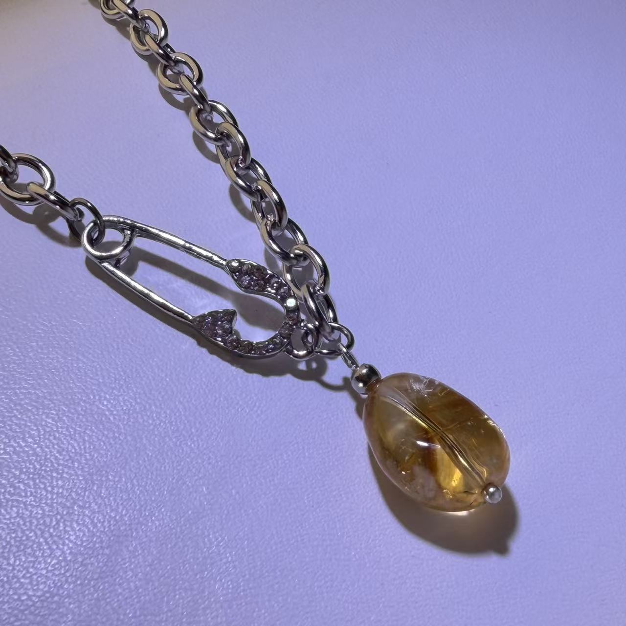 这款独特的项链采用天然黄水晶随型珠制成,饰有引人注目的银色调合金链条。一个独特的安全别针式点缀件,镶嵌小型锆石,作为醒目的装饰。项链由精致的延长链和扣环固定。黄水晶随型珠的设计别具一格,彰显了材质的真实性和独特个性,令人一见倾心。这款惊艳的单品营造出高级、优雅、引人注目的氛围,融合了朋克边缘风格与天然魅力和永恒优雅的能量。
