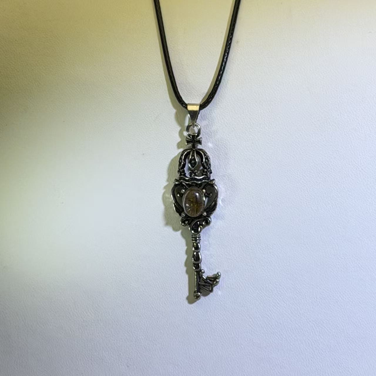 This unique pendant necklace features a captivating copper rutilated quartz cabochon set within an intricately detailed, vintage-style alloy key frame. The crystal displays striking, natural copper-colored rutile inclusions that resemble fine metallic threads or "angel's hair", creating a one-of-a-kind internal landscape that enhances its mystical appeal. Secured by a durable PU leather cord, this piece combines powerful symbolism with a sophisticated aesthetic, making it a bold accessory that commands attention and adds a touch of mythic charm to any outfit.
