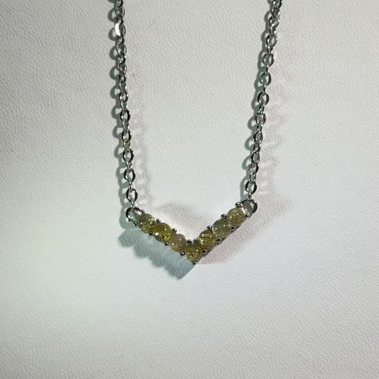This striking necklace features a delicate silver-toned V-shaped bar design with smooth, modern lines. Several natural golden rutilated quartz stones form the focal point, encased in an intricate setting that enhances its unique golden needle-like inclusions and natural allure. The combination of the unique golden natural patterns within the quartz and the shimmering metal creates a captivating aesthetic that is both modern and elegant. This eye-catching accessory is highly versatile, effortlessly transitioning from professional office wear and sophisticated evening events to weekend casual ensembles, and also serves as a perfect thoughtful gift.