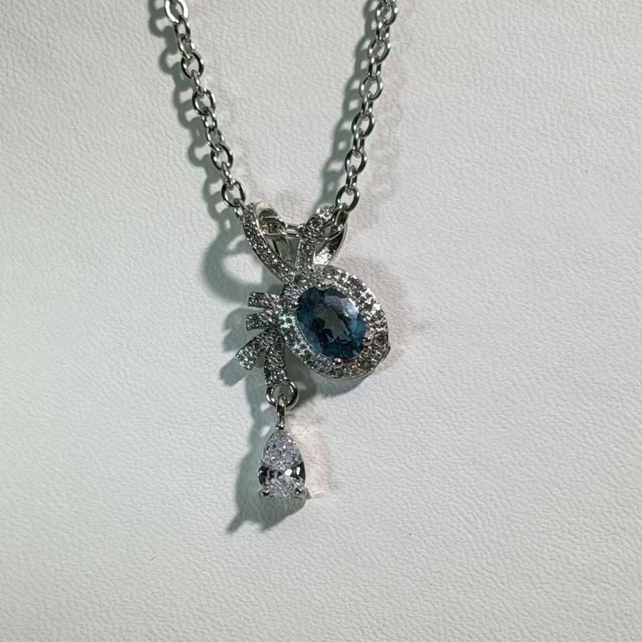 This stunning necklace features an elegant silver alloy pendant designed with a charming ribbon or bow motif above the main stone and a sparkling teardrop CZ drop accent below. A substantial faceted London blue topaz stone forms the centerpiece, enhanced by clear CZ accents that amplify its dramatic, deep blue allure. The contrast between the rich, deep blue of the topaz and the brilliant sparkle creates a captivating aesthetic that is both modern and elegant. This eye-catching accessory is highly versatile, effortlessly transitioning from professional office wear and sophisticated evening events to weekend casual ensembles, and also serves as a perfect thoughtful gift.