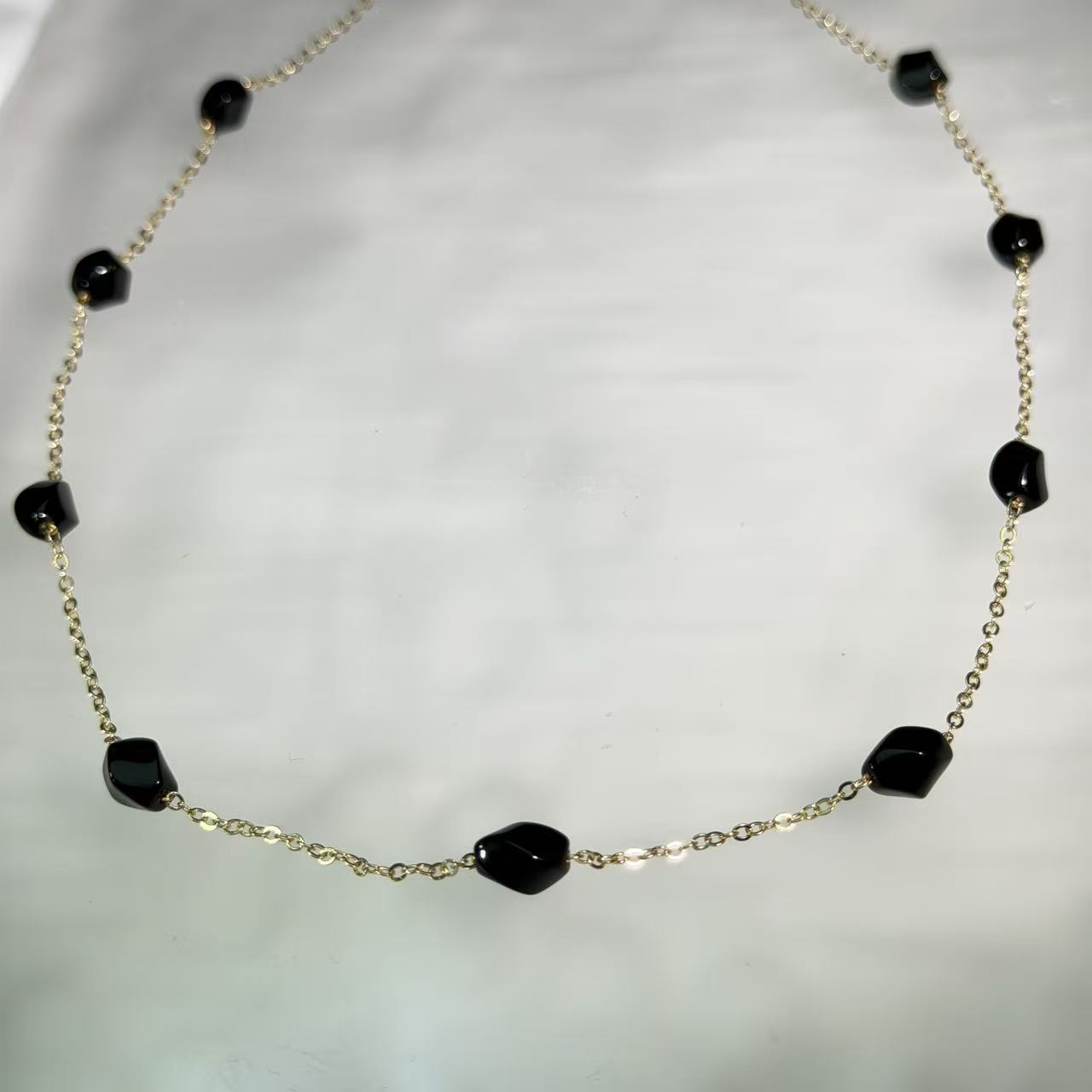 这款独特的项链采用天然黑曜石珠制成,融合了波浪形和刻面切割等多种形状,饰有精致的14K注金链条。黑曜石的设计别具一格,彰显了材质的真实性和独特个性,令人一见倾心。项链配有传统的扣环,确保牢固舒适地贴合。这款惊艳的单品营造出高级、优雅、引人注目的氛围,融合了时尚边缘风格与天然魅力和永恒优雅的能量。