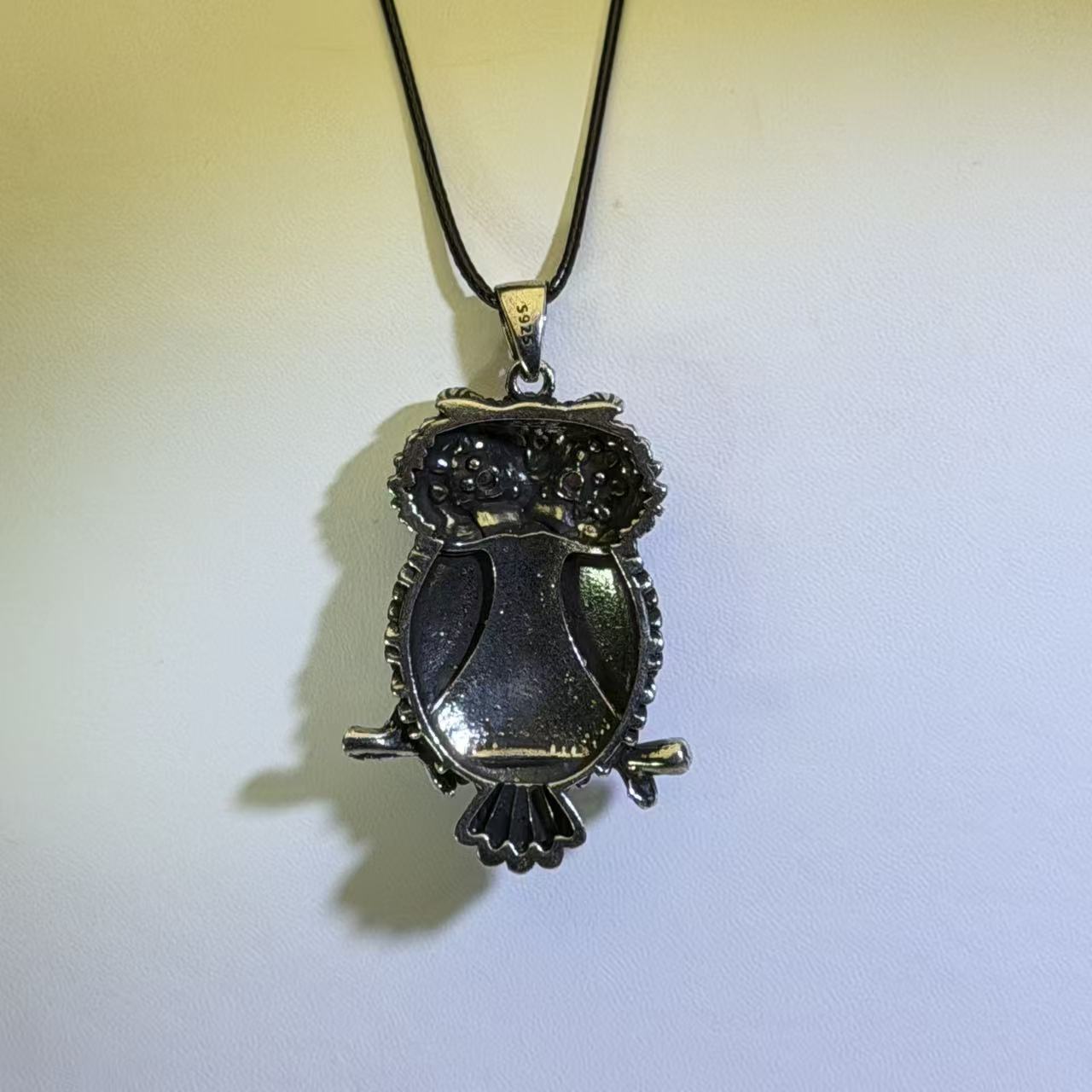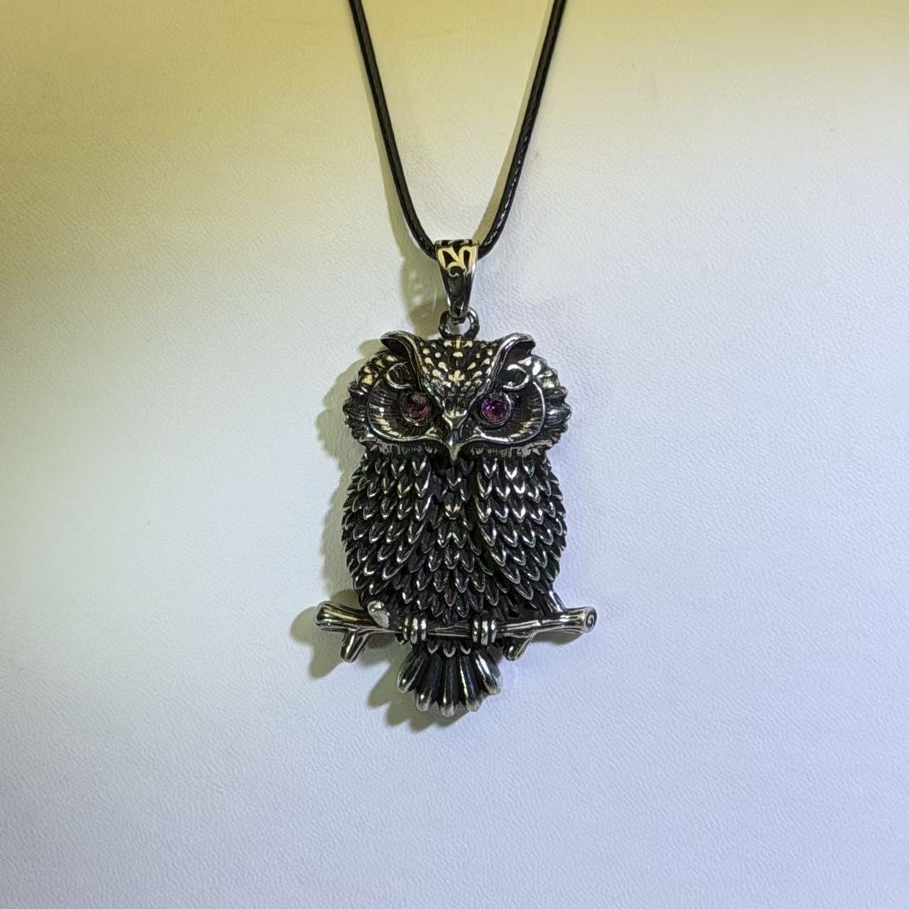 This striking pendant necklace features a finely detailed owl figurine crafted from alloy with an oxidized finish, giving it a vintage, dark aesthetic. The owl is perched on a branch, and small, deep purple rhodolite garnet faceted stones are precisely set as its eyes, adding a vibrant pop of color and life to the piece. Secured by a durable PU leather cord, this accessory combines rustic charm with a modern, adjustable fit, making it a versatile and eye-catching statement piece for any outfit.