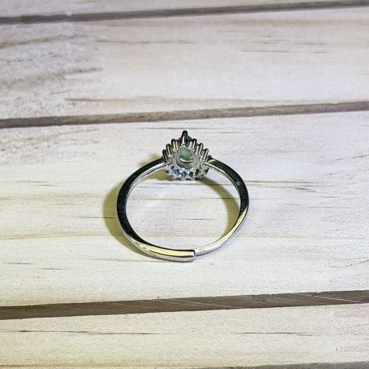 This adjustable ring showcases a vibrant teardrop emerald, encircled by sparkling CZ accents, creating a refined and eye-catching look. The combination of the rich green hue and the halo of brilliance gives the piece a graceful, elegant, and slightly luxurious feel. The adjustable band ensures a comfortable fit on different finger sizes.