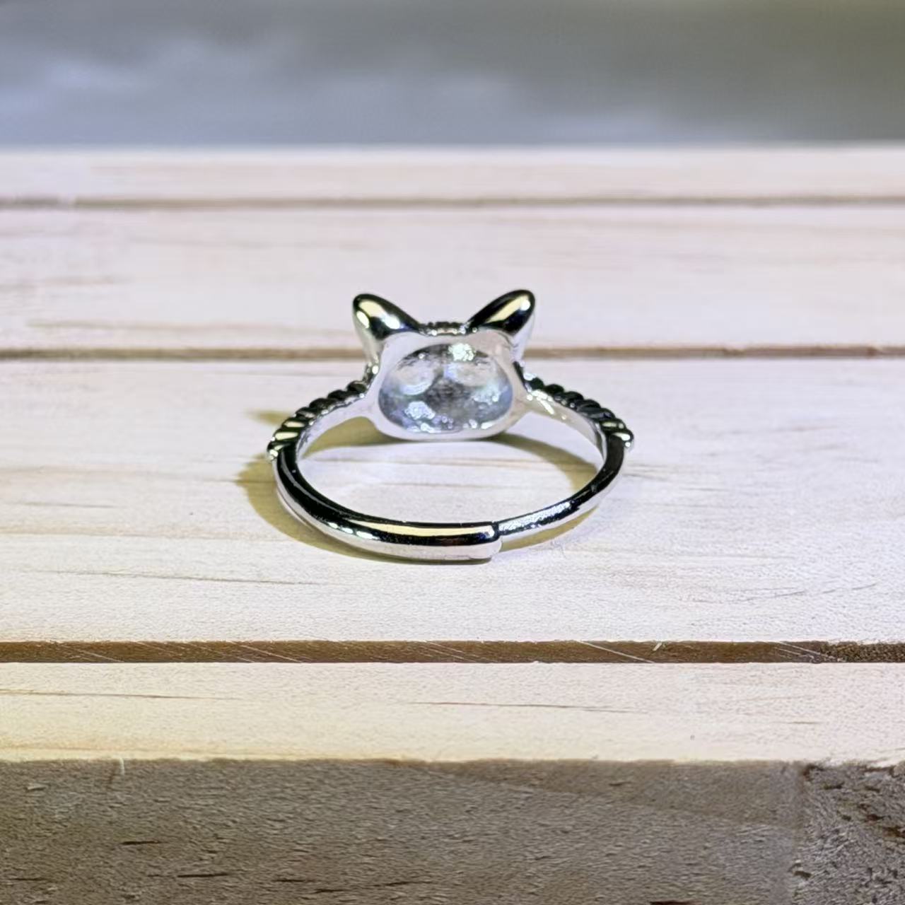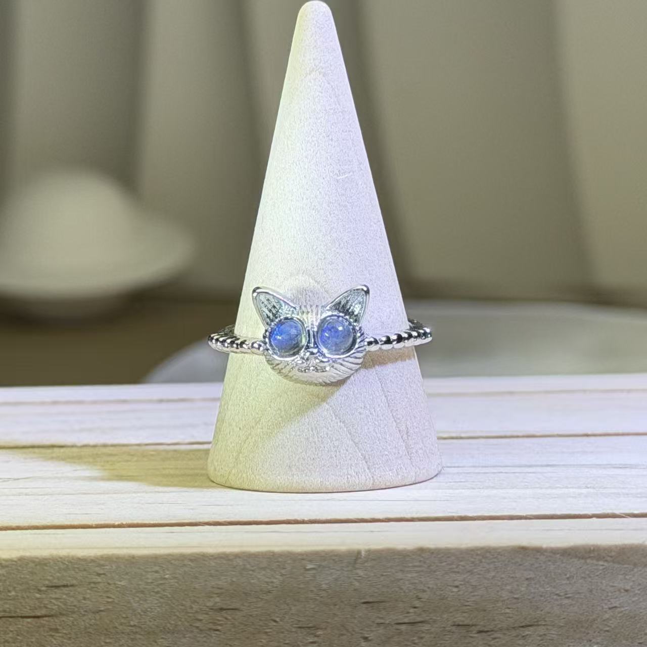 这枚活口戒指以拉长石灰月光石打造的小巧猫头为视觉中心,两颗蓝光拉长石灰月光石圆珠作为眼睛,光泽迷人,增添趣味与灵动感。可调节的活口设计佩戴灵活舒适,既可爱又实用,适合日常佩戴。