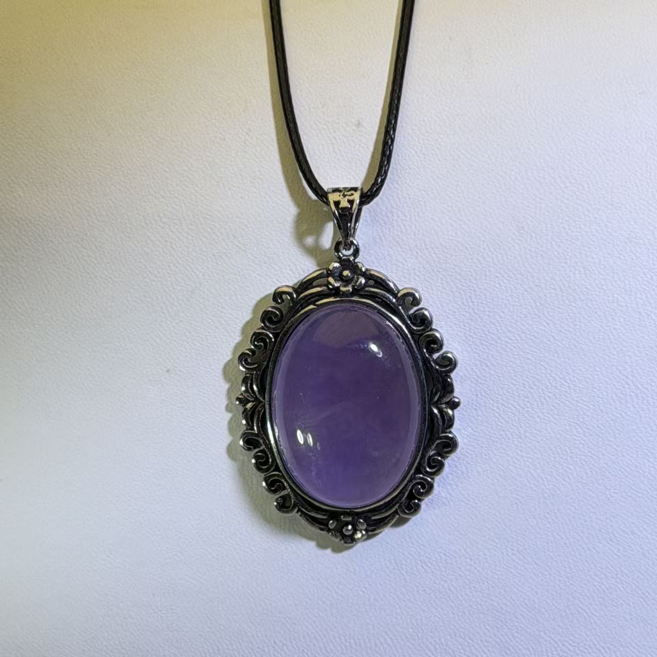 This elegant pendant necklace features a vibrant, oval amethyst cabochon set in an ornate alloy frame with a vintage aesthetic. The rich purple stone displays a beautiful luster and smooth, polished surface that contrasts with the detailed metalwork. Secured by a durable PU leather cord, this piece combines classic charm with a modern, adjustable fit, making it a versatile and eye-catching accessory that adds a touch of sophistication to any outfit.